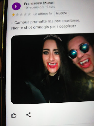 Read moreIl campus regala sempre serate indimenticabili. Già quando ci si mette piede all’interno ci si sente a casa: le luci soffuse sparse per il locale, l’interno interamente in legno e il lungo bancone creano il tipico ambiente da pub. Ampia scelta di birra, grosse risate e tanta bella compagnia, così potrei riassumere in poche parole questo locale. Un big up per le ragazze, che nel caos totale, nonostante avessi occupato più volte la postazione dove ritirare i drink da portare ai tavoli, si sono mostrate super gentili e cordiali. Fenomeni i ragazzi dietro al banco, veloci e attenti. Pur avendo avuto qualche problema tecnico l’altra sera, sono riusciti a soddisfare le richieste dei clienti dimostrando professionalità e grande capacità di problem solving. Ci...