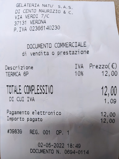 Allora, ricapitolando da Natu se comprate 3 coppette da 2 palline spendete 8,70€ (3x2,90), se prendete una vaschetta da 6 palline.... 12€ (come me). Ho chiesto come mai fosse così e mi è stato detto che c'è molto più gelato: "nelle coppette le palline sono da 70-80g, qui anche da più di 100". Ora, posto che non c'è comunque proporzione... Sono arrivata a casa e per curiosità ho pesato, palline intonse ... secondo la mia bilancia (non professionale per carità) non è nemmeno così, siamo sugli 85g. Quindi.. gelato sempre buono eh, ma se volete strapagarlo fate come me: vaschette da 6 palline! Colpa mia che non ho chiesto il prezzo prima evidentemente, ma spero che almeno la recensione serva ad altri. - Ho modificato la recensione dopo la risposta del gestore per non fare, involontariamente, accuse eccessive. Non mi sento truffata, e la mia è una visione personalissima: io posso essermi sentita un po' presa in giro, ammetto, ma un altro al mio posto potrebbe sentirsi estremamente valorizzato nello spendere...