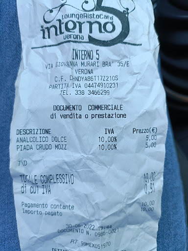 Read moreUn po' troppo modernista per trovarsi in una delle piazze più storiche d'Italia, il bar Interno 5 rappresenta comunque un punto fisso per gli amanti del buon vino di Verona. È possibile gustarsi un buon caffè prima di iniziare la giornata, assaporare un calice di vino in pausa pranzo, così come sorseggiare un ottimo aperitivo all'uscita dal lavoro, sempre immersi nel centro storico della città. La professionalità del servizio è assicurata, e mette voglia di ritornare. Locale di gran classe, ricercato, che fornisce un buon biglietto da visita sia al turista straniero sia al più comune (a seconda delle stagioni!)...