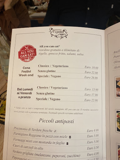 Per tutti vengono portate tigelle e gnocchi fritti. Con le porzioni sono molto timidi; è necessario farcirli come fossero delle torte di compleanno per finire i piatti, altrimenti si rimane senza tigelle o gnocchi anche solo per riuscire ad assaggiare tutto.
