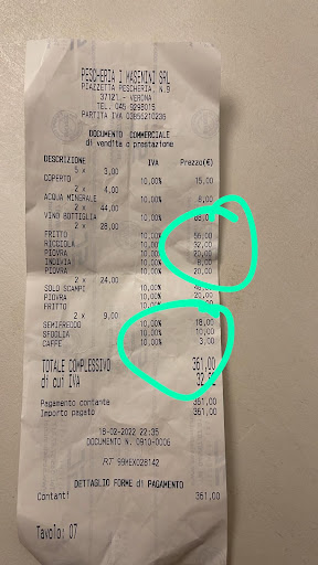Read moreAPPENA TORNATI DA CENA CON AMICI DAI MASENINI PESCE IN PIAZZETTA PESCHERIA A VERONA. PREMETTO CHE NON E LA PRIMA VOLTA CHE ANDIAMO A CENA IN QUESTO LOCALE E SINCERAMENTE CI SIAMO SEMPRE TROVATI BENE ANCHE SE CARO MA COME SI DICE LA QUALITÀ SI PAGA E IO SONO PIENAMENTE D'ACCORDO, MA STASERA E SUCCESSO DEL INCREDIBILE DOPO CHE UN MIO AMICO MI HA PRENOTATO IL TAVOLO E SOPRATTUTTO MOLTO AMICO DEL PROPRIETARIO, ABBIAMO MANGIATO MOLTO MOLTO MALE, SERVIZIO PESSIMO, MA QUELLO CHE NON RIESCO A CAPACITARMI CHE AL MOMENTO DI PAGARE IL CONTO,PAGO E QUANTO ESCO FUORI CONTROLLO LO SCONTRINO E MI ACCORGO CHE MI HA MESSO IN CONTO 3 € DI UNA TAZZINA DA CAFFÈ VUOTA CON UNA BUSTINA DI ZUCCHERO CHE ABBIAMO ORDINATO PER NOSTRA FIGLIA CHE HA L'ABITUDINE CHE QUANDO ANDIAMO AL RISTORANTE A FINE PASTO ORDINA UNA TAZZINA DA CAFFÈ VUOTA CON UNA BUSTINA DI ZUCCHERO PER GIOCARE, STIAMO A DI UNA BAMBINA DI 4 ANNI, E ALLORA IO MI FACCIO UNA DOMANDA MA QUANDO POTRA MAI COSTARE UNA BUSTINA DI ZUCCHERO? E SOPRATTUTTO LA COSA PIÙ ASSURDA SONO I 20 € SEMPRE PER LA BAMBINA DI 5 E RIPETO 5 ANELLI DI CALAMARI FRITTI....SICURO NON METTERÒ PIÙ PIEDE IN QUESTO POSTO MA SOPRATTUTTO VOREI CHIEDERE AL PROPRIETARIO CHE PRIMA DI FARE I CONTI DI TORNARE LUCIDO E IN SE STESSO... 3 EURO PER UNA BUSTINA DI...