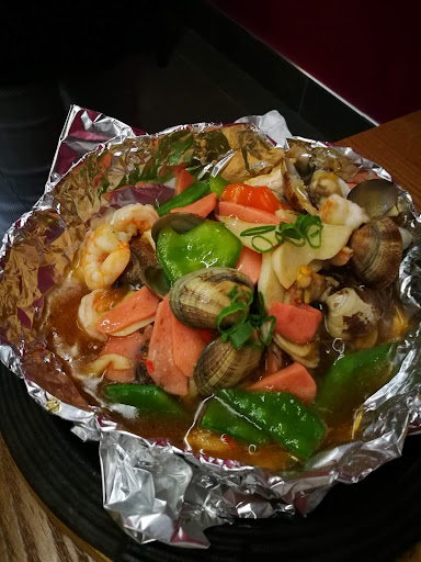 Read moreEntriamo dalla porta automatica e subito ci si presenta davanti una vasca con delle aragoste ed astici vivi, il che mi fa sperare bene, magari in una cucina un po' curata...invece... A parte il luogo dove è situato il ristorante, imboscato a dir poco, il lato positivo è che c'è parcheggio e questo è una nota positiva. Sulla destra c'è del pesce in mostra poi a seguire un bancone frigo grande e spoglio, poca roba in esposizione e tutta avvolta nella pellicola trasparente, non un bel vedere. Il locale è carino, moderno anche se le sedie ricoperte sanno di matrimonio degli anni '90. Il tavolo dove ci siamo seduti era appiccicoso, non pulito bene. Il cibo che abbiamo ordinato non era unto e questo è un bene. Il riso nella media anche se avevo ordinato misto mare e mi è arrivato con anche del wurstel dentro. I ravioli di gamberi al vapore scadenti, pasta troppo grossa, ne ho mangiato solo uno. Spaghetti di riso saltati con gamberi e verdure avevano 4 gamberetti e solo i germogli come verdura. I calamari fritti...beh una scelta infelice, come pure il caffè, da evitare. Il pollo al bambù e funghi discreto, si fa mangiare. Ho speso circa 10 euro in più della media per i ristoranti cinesi. Cmq ho trovato di peggio. Voto 3...