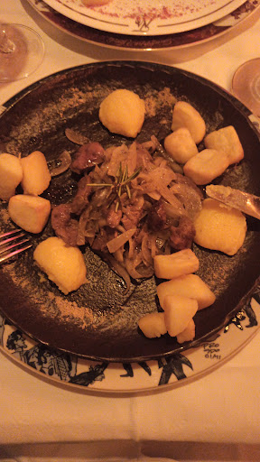 Read moreWhat an opera tourist trap! The food is of the lowest quality, but made up as if it were fancy, and it's absolutely ridiculous. We had gnocchi that tasted like they came from a can served a slate dish like it was 1990, a completely insipid, unseasoned mushroom dish served under a cloche; a piece of meat covered in artificial demi-glace, covered in a sheet of leaf gold that made it look like it was wrapped in a survival blanket (which wasn't a bad idea, given that it was barely warm and the plate was stone cold), and a piece of poultry on a red wine sauce that had so much corn starch in it I could pull it of the meat in one piece. Both accompanied by a few tired potatoes well past their prime. When the bill came with a 15% service surcharge automatically added, we were already so fed up we didn't even argue. I assume it is advertised somewhere on the last pages of the menu, but I had failed to spot it. The service was okay, apart from the occasional 'opera' singing performances of some of the staff which maybe Charles Ives could have appreciated, but for our more tonally-inclined ears where only a fitting accompagnement for these sad...