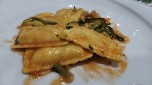 Il secondo primo prevedeva ravioli con burrata ma ci è arrivato ravioli con ripieno di ricotta (di bassa qualità), in sugo di pomodorino giallo assoluto e della crema di ricotta (la stessa del ripieno) spruzzata sopra. La pasta è risultata pessima. Immangiabile. Acidissima e di un gusto orrendo.