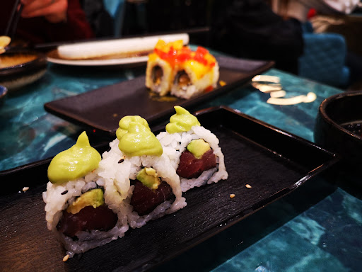 Read moreSiamo andati in 4 un venerdì sera di gennaio, un mese dopo l'apertura del locale. Alle ore 20.45 abbiamo cominciato ad ordinare con la comoda app gestibile ognuno x sé stesso che funziona così :ognuno può ordinare 6 piatti, si attende 10 min e poi si può continuare così. L'ultimo giro di ordinazione di cibo è intorno alle 22.00. Ci sono moltissimi antipasti e roll che altrove non si trovano per esempio quelli con uovo di quaglia crudo, tartufo, mango, salsa guacamole, tartare con salsa ai frutti di bosco, Con pomodorini, con polpo crudo, burrata ecc. Il sevizio lo valuto ní, per il motivo che per mezz'ora io che ero l'unica ad aver ordinato prodotti crudi sono rimasta senza alcun piatto e si trattava di nigiri semplici, antipasto e tartare mentre gli altri erano alla ricezione del loro secondo giro. Qualità nella media, negli all u can eat ho trovato di meglio comunque. La tartare di Gambero non aveva sapore, quella con salmone e cappero non era chissà cosa. Inoltre aspettate così tanto per un solo nigiri in 1 piatto é un po' strano, solitamente te ne portano almeno 2 quando si ordina quel piatto. Comunque sottolineo che è giusto che ogni ordine abbia il suo piatto e che non vengano uniti più pietanze diverse ordinate per il semplice fatto che potrebbe esserci un intollerante che ha scelto dei prodotti che lui è certo di mangiare e qualora si trovassero insieme ad altri non potrebbe consumare. Ci sono opzioni vegan, senza glutine, senza lattosio e anche vegetali. Il prezzo a cena è 25.90 +2di coperto da l'acqua viene 2.50 a bottiglia, e il caffè 1.50. Torneremo se saremo di passaggio, per non non è proprio dietro l'angolo. La location è molto bella ed ampia, peccato per il pavimento che è veramente unto e scivoloso.