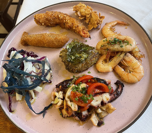 1 antipasto di mare composto da vari assaggi di polpo, calamaro, gamberi in diverse cotture e pesce spada alle mandorle (Ottimo!)