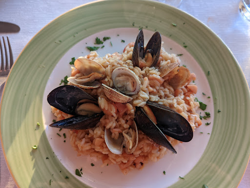 For mains, we had the sea bass fish of the day and the seafood risotto. Both were devoid of flavour. The sea bass was fine but the courgettes and aubergine were elastic and covered in olive oil (no taste) and the potatoes were undercooked. The risotto was incredibly salty (more than to be expected with seafood) and had little to no extra flavour.