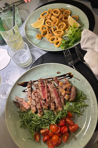 Excellent restaurant connected to hotel. We spontaneously found this place for dinner and although we didn’t have a reservation they were able to accommodate the two of us. Our waiter/server was Antonio and he was friendly and helpful from start to finish! The place although had every table filled were spread apart enough that we didn’t feel crowded or overwhelmed. The music was a perfect volume and added to the atmosphere. Views are amazing. Now to talk about the food, I had the candle shaped penne with pecorino and it was just was I was craving! Great taste. I also had the beef sirloin with tomato which was also good but not as good as the pasta. My friend had the calamari which we enjoyed and the seafood risotto which I think was our favorite dish of all! To drink we had a limoncello spritz and mojito. I enjoyed both because they weren’t too sweet but I know some people would...