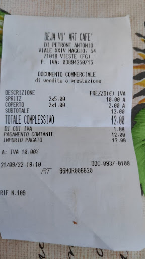 Read moreSe in queste torride giornate ti cogliesse l'arsura, fai tappa al Dejavù, dove il mojito più buono di tutta Vieste e non solo, saprà ridare pace alle tue membra e al tuo spirito! Johnny e i ragazzi dello staff sono gentili, veloci, simpatici e attentissimi ai clienti! La sera DJset per divertirsi un po'! Il posto è carino, con tavoli esterni, in zona comoda x parcheggiare e accedere da qui, al centro di Vieste (magari nn proprio super centralissimo ma in zona pedonale la sera) noi ci torniamo ogni giorno! Trovate il Dejavù anche in zona porto, in versione più easy, per scatenarsi con musica a tutto volume!! Mi sento di...