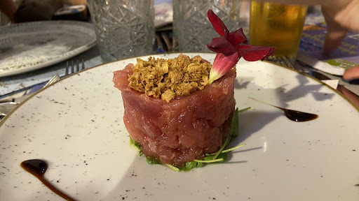 Das Tatar vom Thunfisch war zwar schön grob geschnitten, jedoch sehnig und quasi ungewürzt bis auf ein paar Tropfen Olivenöl. Obendrauf türmte ein dicker Esslöffel convenience-Röstzwiebeln. Kann man von halten was man will, kulinarisch haben sie keinerlei Sinn.