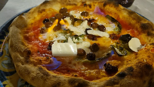 Pizza alla 'nduja. Ben lievitata e generosamente cornicionata la base della pizza. Ben cotta. Arrivo di effetto con la pizza fiammante da rapida e scenica accensione del cameriere. Un unico difetto. Poca la 'nduja, l'avrei chiamata pizza alle olive perché c'erano tante più olive (buone) che 'nduja come è visibile nel video da me allegato.