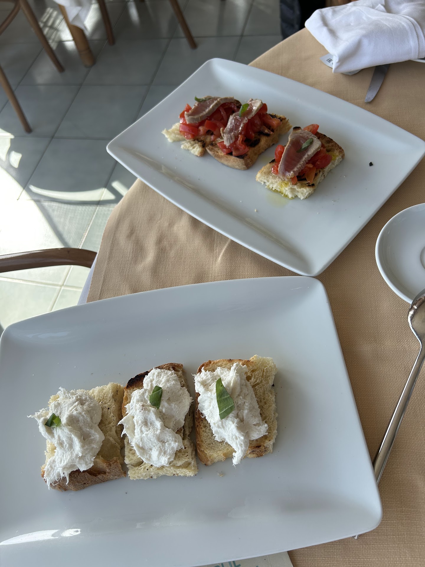This a really nice restaurant, located in a great spot, right by the seaside. It is mainly fish based, and you can see the great quality of the food they serve. We started with some mini bruschetta, one with cod mousse, one with tuna and tomatoes. I ordered the soute di frutti di mare to start with , my friends the ravioli, the octopus with cardoncelli mushroom, the sea salads, and then I also ordered the tuna with vegetables. All of this was paired with a very nice white wine called Proclamo, a perfect accompaniment to the fish dishes we had . We ended the meal with 3 desserts, namely a tiramisu, a strawberry millefeuille, and a pear and ricotta cake. All of them very good, the best was the pear and ricotta, it really was a bit above the others. As for the service, a very special mention to the maitre d’, he was really nice, smiling and competent, who suggested the pear liquor that ended a very nice meal in a perfect setting, literally on the beach . I highly recommend this, and I would definitely recommend going for a late lunch, so you can enjoy the great setting, indulging in the basking light of a...