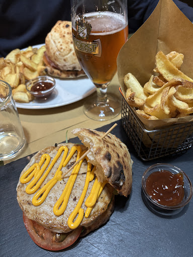 Cibo: 1 stella. Le pizze non si possono definire tali, mentre gli hamburger che abbiamo preso noi avevano un sapore… di cibo surgelato. Un “pub” se si può definire così, non può e non deve permettersi di servire cibo del genere. Altro aneddoto: ordino un panino con hamburger di pollo, formaggio cheddar ed altri ingredienti. Cosa arriva? Panino con hamburger di pollo (100% surgelato) e SALSA cheddar (no formaggio) e gli altri ingredienti del menu. Facendolo notare allo staff, guardano il panino stranite e non sanno il motivo, in qualche modo cercano di giustificare lo “chef” dicendo che se non c’è la fetta di formaggio all’interno vuol dire che forse è finito (hahaha). È davvero ridicolo non seguire il menù o - se veramente manca qualche ingrediente - non avvisare il commensale. Le patatine si salvano (surgelate anche quelle 🤭).