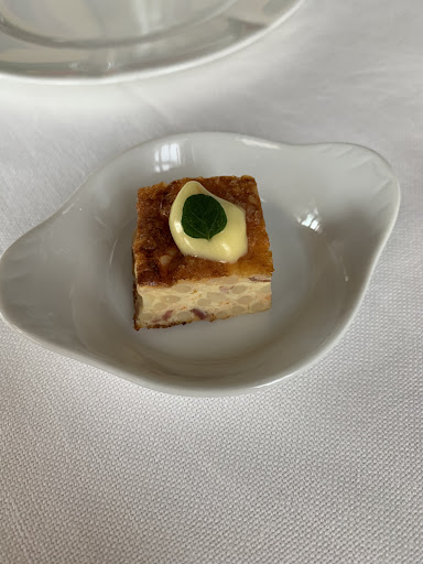 Abbiamo scelto un menĂš degustazione con aggiunta di vino (tra le foto il menu). Il menu cambia in base alla stagionalitĂ delle materie prime. Iniziamo lâesperienza con una piccola entree a base di mini frittatina e pane rustico e sfoglie croccanti di loro produzione ed accompagnati da olio. Come primo antipasto una Battuta a coltello di baccalĂ semicotto e gamberi, patĂŞ di ceci al rosmarino e miele, salsa verde Come secondo antipasto un Uovo morbido, passata di fagioli borlotti di Gambolò, cipolla di Breme ripiena di se stessa peperoni e caciocavallo