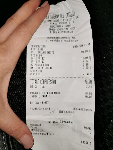 Read moreServizio PESSIMO PESSIMO PESSIMO! Siamo entrati per fare l'aperitivo con tagliere che pubblicizza a o all'esterno a 8.50€, dopo 30 minuti d'attesa per entrare il cameriere ci dice che quel prezzo è valido solo per l'aperitivo serale ( e già li mi chiedo perché esporlo a pranzo allora?) Ci abbandona e nel guardare il menù lasciato ci per QR code, decidiamo di prendere 4 taglieri ( 10 euro l'uno, prezzo abbastanza onesto), 4 spritz, 1 coca cola e una bottiglia d'acqua ( come si può vedere dallo scontrino). Ci viene portato l'aperitivo, ma niente taglieri.. Dopo 40 minuti d'attesa decido di fermare lo stesso cameriere con il quale avevamo ordinato per chiedere quanto mancasse per mangiare e la risposta è stata : " perché...? Non avete già mangiato? Da lì a poco arrivano i taglieri, mangiamo e mi alzo per andare a pagare... Il conto come potete vedere parla da solo... I taglieri 10 euro l'uno ci sta... Gli spritz 6 euro laperol 7 il campari... Peccato che in menù fosse scritto aperitivo alcolico 3.50 €.... 1.50€ di coperto a testa per mangiare su delle semplici tavole di legno apparecchiare solo con tovagliette di carta e posate... NEL LUNGO TEMPO D'ATTESA comunque abbiamo potuto notare che non eravamo gli unici scontenti... Il tavolo dietro di noi ha chiesto il caffè e il conto ben 5 volte... Alla fine si è dovuto alzare e andare al banco... Alte persone che fermavano i camerieri dicendo " credo ci siate dimenticati questo"... I camerieri sembravano TUTTI con dei problemi.... Tanto che prima di scrivere questa recensione sono andata a controllare su internet che non fosse un posto che assume tutte persone disabili ( perché in quel caso ovviamente, si prendono le cose in un'altro modo giustamente...), ma niente... A ricerche fatte il locale non fa parte di associazioni che aiutano persone in difficoltà... Quindi io mi chiedo.... E mai possibile che con 5 camerieri che girano ( parlando solo di quelli a servizio fuori), ci sia un disservizio simile? ( calcolando anche il fatto che il posto è piccolo...) per quanto riguarda la cifra pagata? Esposizione dei prezzi poco chiara o scorretta e prezzi in alcuni casi giusti ( considerato il luogo turistico) in altri casi decisamente No! Torneremo a fare qualche gita sul luogo ma certamente non ci fermeremo più in questo...