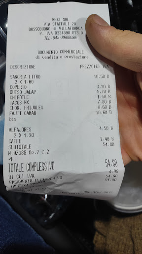 Read moreLocale a tema messicano situato nella zona artigianale di Dossobuono. Appena si entra si percepisce chiaramente il tipo di locale: le pareti colorate e l'arredamento stile sudamericano ti fanno vivere un'esperienza unica. Riguardo alla cucina non sono un'intenditore del messicano ma posso confermare che la vasta gamma di piatti basta a soddisfare le richieste di ogni cliente: infatti sono presenti pietanze a base di carne, pesce, pollo, insalatone e hamburger. Per essere un amante del piccante estremo mi aspettavo qualche proposta un pò piú "strong" ma ho comunque apprezzato il formaggio con jalapeno e il piatto di fagioli piccanti. Unico diffetto il vino usato per la sangria non ci è molto piaciuto, ma andava giu comunque bene. Complimentissimi per la salsa a base di fagioli, era strepitosa! Prezzo assolutamente onesto, in coppia abbiamo speso 54 euro circa e abbiamo avuto modo di assaggiare una buona varietà di piatti, buoni i dolci. In conclusione siamo trovati benissimo e sicuramente ci ritorneremo durante l'estate per poter godere dell'ampio...