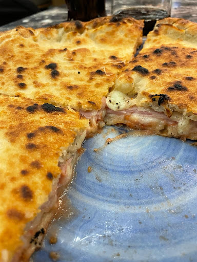 La pizza è pazzesca: cotta nel ruoto, quindi con quel bordino croccante e rustico che dà subito l’idea della pizza fatta in casa, ma con la mano esperta di chi lo fa da una vita. L’impasto è digeribilissimo, leggero, ma saporito. Si sente che dietro c’è attenzione, lievitazione lenta, ingredienti scelti.
