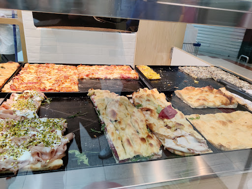 Read moreLa pizza nel suo insieme mi ricorda vagamente quelle pizze che mangiavo da ragazzino, preparate in teglie abbastanza unte di olio. La pizza è risultata nell'insieme croccante ma il trancio di Margherita non mi ha stupito più di tanto, qualcosa nella salsa mancava. Provati altri 2 pezzi (prosciutto e quella con le patate) e quella scintilla che dice voglia di pizza vado lì non l'ho sentita. Più che altro il prezzo probabilmente mi ha stupito. Siamo pur sempre in un contesto di una galleria di un centro commerciale, dove al di la del servizio al banco e la facciata posteriore del chiosco che da visibilità del loro piccolo laboratorio non c'è...