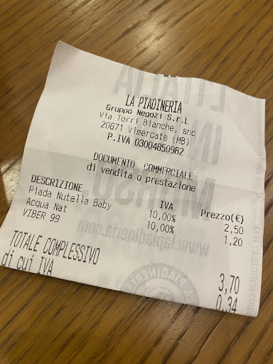 Giorni fa decido di prendere una piadina con dentro tonno e maionese. Ecco non prendetela mai se capitate in questa Piadineria se volete un consigli. La ragazza che le faceva a quanto pare non le sapeva fare perché nella piadina praticamente c’era solamente 1 kg di maionese (ne ho buttata metà e non ho potuto nemmeno avuto modo di farlo presente in quanto in tutto il negozio c’era solo una persona impegnata a toccare soldi e poi toccare cibo subito dopo) a quanto pare nemmeno troppo fresca. Una volta mangiata mi è iniziata a venire una nausea assurda,i seguenti giorni vomito crampi addominali ecc… sarà stata quella? Non so, non voglio incolpare nessuno ma di certo la piadina non era delle migliori. State attenti e soprattutto se vi capita di passare lì prendete le più basic perchè senno aspetterete una vita emmezza per una piadina e non solo. Parere mio mai più.