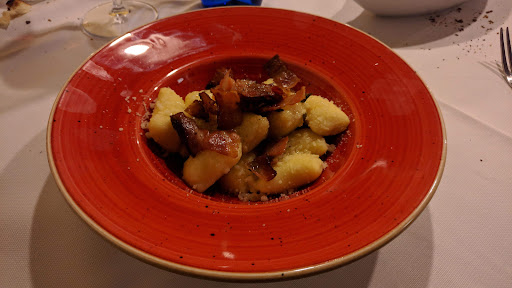 Read moreOreno, un paesino signorile nel vimercatese. Strade silenziose e ville signorili. Location perfetta per una sera di inizio estate fra amici. Il locale è articolato su più piccole sale comunicanti fra loro. Buona acustica, muri in pietra e soffitto con travi a vista. Personale cordiale che ci offre un bicchierino di prosecco purtroppo non freschissimo e un entrè gustosa e ben impiantata anche se con semplicità. Buono l'antipasto ma più gustosa la giardiniera croccante che l'accompagnava. Fuori menù optiamo per dell'ottimo branzino, freschissimo, con pistacchi di Bronte e pomodorini pachino...delizioso ma non sufficiente a placare la fame. Concludiamo con un cestino di croccante, frutti bi bosco e gelato alla pera:una goduria per il palato! Delicato ma buonissimo... Lo chef sollecito e presente, sembrava assomigliare al più noto Cracco anche nei modi a tratti insofferenti al nostro chiedere. Complessivamente una buona esperienza che ripeteremo in autunno/inverno perché ci piace immaginare il calore del camino, la luce soffusa delle lampade e quell'aria un pò retro di un posto antico, vissuto... con la segreta speranza che non...