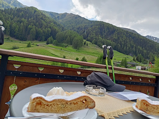 Locale accogliente con terrazza con vista panoramica stupenda. Ottimo il panino caldo con speck, prosciutto cotto, cipolla,pomodori e formaggio.... così invitante e gustoso che non l'ho fotografato 🤤 Buonissime le torte, home made, e super la radler freschissima. Servizio ottimo e attento. Buon rapporto qualità/quantità/prezzo. Locale dog friendly sia in terrazza che all'interno 🐾🐾🐾🐾 Da provare assolutamente se percorrete il sentiero che dal parcheggio a valle della seggiovia sopra a Burgusio porta a Slingia