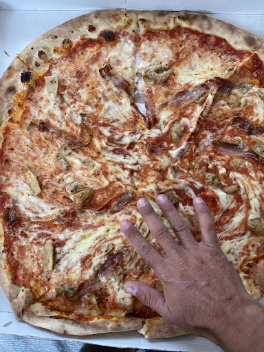Read moreDiciamo che sono un locale che per il 90% fanno pizza da asporto, ma si sono attrezzati anche per farla mangiare lì, il posto è molto semplice ed essenziale ovviamente, ma infatti non è per quello che si va lì, è la pizza che che fa da ago della bilancia e devo dire che è buonissima, piena di ingredienti, e gigantesca, ho dovuto mettermi l'ultimo quarto nel cartone e portarmela a casa perché non c'è la facevo più e che io non finisca una pizza è cosa veramente rara (3 volte in 10anni). Diciamo che la varietà non è enorme, anzi un pò limitata a dir mio, ma comunque soddisfacente, inoltre lele pizze proposte non convincono si può creare la propria pizza con gli ingredienti a disposizione e mischiarli a piacimento. Personale molto gentile, i titolari che sono sempre lì sono divertenti e cercano di consigliare. I prezzi sono un peletto più cari del solito ma sono giustificati dalla grandezza della pizza e della quantità di ingredienti che mettono. Certamente se ripassiamo da Prato sarà una...