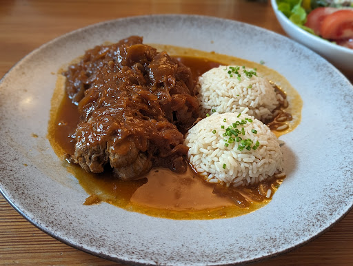 Read moreSuper Authentisches Restaurant, ich hatte das Gericht des Tages & hierbei handelte es sich um einen Zwiebel Schmorbraten mit Reis & einem zusätzlichen Teller Salat dazu. So eine gute Fleisch Qualität lange nicht mehr gehabt (war Fleisch direkt von einem Bauer in der nähe & alles Regional), das Rindfleisch war noch schön Rosa, saftig & geschmackvoll (man hat auch noch trotz leckerer Soße noch viel vom Rind geschmeckt, Reis hat perfekt dazu gepasst & die Soße war geschmacklich auch wunderbar. Das einzige wo man sich drüber streiten könnte war die Konsistenz der Soße, die war eher flüssig & ich kann mir vorstellen das viele Leute es eher dickflüssiger gut gefunden hätten, dennoch hat es mich null gestört & es war wirklich ultra lecker. Der Salat und das Dressing dazu waren genauso gut, frisch und lecker.