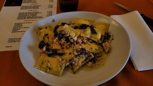 Read moreAssolutamente da evitare. Pranzo veloce per due persone ,antipasti: 1 antipasto del pescatore pessimo , mi aspettavo gamberi di fiume e invece mi si presenta un piatto misero con gamberetti in salamoia scadentissimi con salsa rosa, salmone affumicato da discount e bruschetta con poco olio . 1 .Bruschetta mista poco curata e misera. Primi: tortellini con ragù e tartufo, tralasciando l'accostamento da denuncia del ragù rosso con il tartufo, i tortellini erano scadenti il ragù allungato e il tartufo che sapeva di olive. Tagliatelle ai gamberi di fiume, semplicemente pasta al pomodoro con due piccoli gamberi cotti palesemente prima. Non so se è semplicemente incompetenza o intento di...