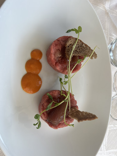 Read moreIncantevole la veranda esterna, tavoli tuttavia molto scomodi. Molto apprezzato l’amuse bouche iniziale. Tartare ottima come quantità e qualità, condimento deludente, eccetto le cipolline molto buone (non si dovrebbe arrivare a usare il sale e l’olio per condirla). Risotto sedano- gorgonzola- nocciole nella media, il formaggio non si sente e le noci non c’entrano nulla nel piatto. Bistecca abbastanza dura, buone le patate. Agnolotti del plin impiattati malino, ho i miei dubbi fossero fatti in casa (anche se bisogna ammettere non vengono spacciati per tali). Dolci purtroppo deludenti, lo zabaione è una schiuma, e non deve essere fatto così, il semifreddo al melone la frutta non l’ha mai vista, mentre la panna cotta non è nulla di che. Personale gentilissimo, molto preparato e professionale, senza dubbio la nota più piacevole del pranzo,...