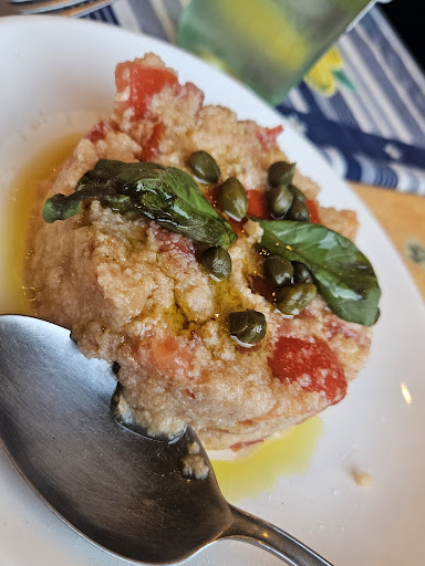 A bit disappointing. We had high expectations after reading the reviews. After being seated a group of locals came in and our service became very slow. The staff were being very welcoming to everyone but us. A member of staff would walk around the restaurant offering everyone some of their wine or cake but never offered us. It came across as if we weren't welcome. No menu as mentioned, which we were excited about. We had bruschetta as a starter, which turned out to be one tomato cut in half on a piece of bread. We both had a pasta as a primi however it came out lukewarm. From what we could see everything was made in advance and then heated up to serve.