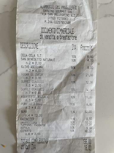 Read moreSURREALE Ci sono stato casualmente la sera di San Valentino con degli amici che non vedevo da tempo. Ho prenotato telefonicamente e non sono stato avvisato del fatto che c'era una serata piano bar (per San Valentino è normale, decisamente pacchiano ma facciamo finta che ci possa stare che non sia stato avvisato). Ci presentiamo, ci portano i menù ed aspettiamo circa 20 minuti prima di riuscire ad ordinare, peccato che quando arriva la cameriera ci dice che più di metà degli antipasti sul menù non era disponibile, mentre ci dice a voce altri antipasti che non erano scritti sul menù, e va bene anche questo, faccio il cuoco di mestiere e so che ci possono essere serate in cui va tutto storto, per cui pazienza ordiniamo gli antipasti e attendiamo. Dopo venti minuti arrivano delle patatine fritte, agli altri antipasti (4 supplì)serviranno altri 15 minuti di attesa , nel tutto patatine fredde e completamente senza sale, tutte sporche di nero (ciò significa che l'olio andava cambiato da un bel po'). E va bene anche questo, nel frattempo, con il locale mezzo vuoto, vediamo che tavoli che si sono seduti decisamente molto più tardi di noi stavano già mangiando, mentre noi continuavamo ad aspettare per 3 pizze, il tutto con la cameriera che continuava a passare a chiederci se fosse tutto a posto ma senza portarci queste benedette pizze. Dopo altri 40 minuti di attesa e vari solleciti alla sala per ricevere queste tre pizze mi alzo per andare a pagare ed andarmene, ma vengo bloccato dalla cameriera che mi dice che le pizze stanno uscendo. Le tre pizze arrivano separatamente con un paio di minuti di distanza l'una dall'altra, devo dire che l'impasto ed il condimento erano ottimi a dir poco, davvero buonissimo e molto al di sopra sia degli antipasti che del servizio. Io avevo ordinato una pizza con alici, stracciatella aglio e origano, sulla pizza l'aglio (in qualunque ristorante d'Europa, e lo dico perché ho lavorato in mezza Europa) viene messo o grattugiato o affettato finemente come da scuola napoletana, ma non all alambicco del presidente, dove viene messo intero con tutta la buccia con gli spicchi nascosti sotto alla stracciatella, così che se non sei attento e diffidente te magni uno spicchio d'aglio sano con tutta la buccia. Alla fine vado a pagare,offrendo io ai miei amici e vergognandomi di aver organizzato una rimpatriata in un posto del genere , e mi sento dire dal titolare che è normale mettere gli spicchi d'aglio in camicia interi sulla pizza perché anche il soffritto si fa così. Io che come un coglione lavoro in una catena di ristoranti extralusso a Milano taccio ed acconsento, consapevole di avere molto da imparare dall'alambicco del presidente di Viterbo. A causa del ritardo mi vengono fatti 8 euro di sconto su un conto di 63 euro, che se ci fosse stata onesta intellettuale e professionale avrebbe dovuto essere azzerato con tanto di scuse. Peccato, perché l'impasto era davvero davvero ottimo, una bella idratazione ed una bella stesura, anche...