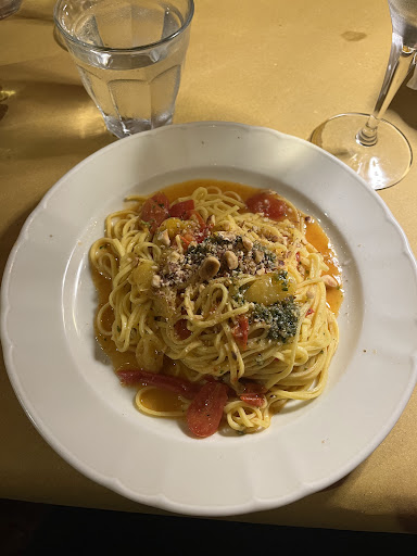 Where do I begin?! From the food, to the service, to the atmosphere, this gem is truly a breath of fresh air. The charming outdoor alleyway, lit by a chain of lightbulbs woven with vines and situated underneath a cozy stone arch, seemed to transport my friend and I to a place and time where no cares were given and all was merry – if ever a time existed... SERVICE: Our lovely servers, especially the warm, exuberant Elisabetta, paid special attention to us and even offered an extra digestivo of a Liquore di Nocciola (hazelnut liquor that tasted like Nutella!). FOOD: Portions were very generous for the cost: big secondi dishes for only €13... doesn't exist in big cities like Rome or Florence! All meat dishes were tender and you could tell were slow-cooked with a lot of heart and care. The pasta dish I got my second visit was almost as thin as angel hair and had an inventive, delicate hazelnut pesto and slow-cooked orange and red pomodorini. Perfect, light dinner. FRESHNESS: I saw a waitress swap out a little paper menu posted outside the front door at lunch, showing an entirely new menu. This was confirmation that all food is fresh, seasonal, and cooked day off. Please, do not deprive yourself of the experience of having dinner here. Lunch is good too, but the charm of the evening atmosphere is too...