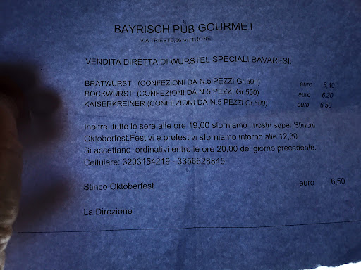 Mi ritengo un pochino 'fregata' dal Bayrisch Pub. Sono stata lì con una Smart box: menu di tre portate per 2 persone più birra e caffè. In verità abbiamo avuto un solo piatto con un pretzel, 4 pezzi di wurstel freddi e un po' di patate fredde oltre a dei crauti. La birra e il caffè c'erano. Mi è stato proposto a pagamento il dolce, che ovviamente ho rifiutato. Nessuna possibilità di scelta sul menù (a me i wurstel neanche piacciono), una puzza di fritto rancio in tutto il locale e questo che, a casa mia, è una portata sola, non 3. La signora, invece, ha detto che per lei sono 3 portate. Forse non conosce il significato della parola... Certamente, mai più in quel locale. Spero solo che la puzza di fritto vada via presto dal mio piumino.