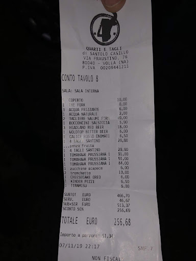 Arrivato il conto siamo rimasti SPIACEVOLMENTE sorpresi (vedi foto allegata): le Tomahawk (risultate di origine polacca e quindi neanche italiana) sono costate oltre 90€ l'una ed erano solo 200gr in più rispetto al menu.