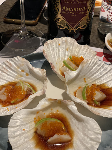 Da chiamare i NAS, livelli igienici pari a zero, tutto il nostro tavolo ha disturbi intestinali dal giorno successivo alla cena e stiamo valutando se segnalare il problema. Prima e ultima volta in questo posto, ce ne avevano parlato bene ma evidentemente qualcosa nella gestione è cambiato di recente. Ambiente apparentemente pulito, poi ti siedi e vedi: cuochi e cameriere che starnutiscono durante la preparazione del cibo senza una mascherina di protezione, cambio dei guanti manco a parlarne. Interazioni sempre dello staff cucina con famigliare minorenne presente nel retro cassa (comprese bave, moccio e altre contaminazioni ovvie per un bambino) per poi via nuovamente a toccare il cibo in barba all'HACCP ed alla sicurezza sul lavoro. Il culmine è stato vedere uno dei cuochi che si strofinava gli occhi e con la stessa mano ha continuato a fare il suo. Avevamo già finito di mangiare il primo ordine sennò francamente ce ne saremmo andati molto prima. Non abbiamo ovviamente ordinato più altro e siamo andati via tutti disgustati. Qualità del pesce scadente e non voglio nemmeno sapere se e come è stato fatto l'abbattimento previsto per legge, l'unico gusto percettibile quello delle salse, sicuramente le carni non erano fresche. Tutto buttato su un piattino bianco lanciato velocemente sul tavolo, molto Fantozziano. Veramente squallido, da evitare se come noi non volete stare male i...