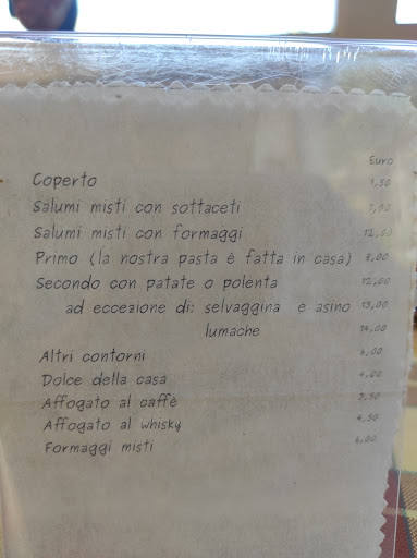 La gestione del ristorante è familiare, gli interni rustici ma molto accoglienti e il personale è estremamente gentile e volenteroso. La cucina è tradizionale e gustosa ma mai scontata (i gnocchetti rosa fatti in casa con gorgonzola e pancetta e le lasagne speck e zucca ne sono una prova), porzioni nella media, prezzi più che popolari e atmosfera conviviale e rilassata. Bellissimi i finestroni panoramici sul paesaggio esterno e le tovaglie a quadrotti. Il menu è vario e ricco di specialità, riportato sinteticamente già al tavolo, vi verrà poi recitato a voce in modo più esaustivo direttamente dal personale, come nelle più autentiche trattorie.