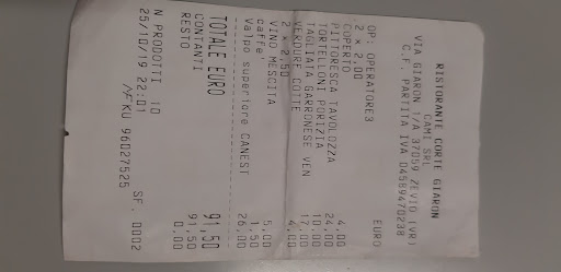 Read moreLascio a tutta la comunità di giudicare cio' che scrivo. Osservate lo scontrino x 2 persone, 1 tagliere x 2- un primo tortelloni di n.6 tortelli, una tagliata e un contorno di verdure, vedi lo scontrino allegato. Prezzi carissimi e niente cibo. Qualità mediocre, mi dispiace ma si mangia molto meglio nelle vicinanze con location da 5 stelle e prezzi alla portata di tutti, e cmq mangi....no bandierine, vasetti e addobbi di frutta fragole e melone. Locale di questo tipo con sedie di paglia, bicchieri da osteria e pavimento trascurato non pulito...devi pagare il giusto. Pessima esperienza e figura di m.... con mia moglie.