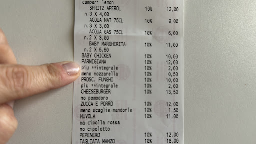 Premetto che questo è un locale che ho iniziato a frequentare qualche mese fa e che mi aggrada nonostante abbia circa 30 km per arrivarci. Il cibo lo trovo buono e top l area bimbi. Una cosa che ieri sera mi ha dato MOLTO fastidio ma che purtroppo per colpa della fretta non ho potuto contestare subito e’ stata la seguente. Cena di compleanno con 19 persone al tavolo, conto da 386 euro leggendo lo scontrino trovo: -una richiesta di mettere meno mozzarella al costo di 0,50 cent (ma come, vi faccio risparmiare sull’ ingrediente e me lo fate pagare?!) -una richiesta di non mettere le scaglie di mandorle sulla pizza (oltretutto le mandorle sulla pizza c erano,ma non abbiamo fatto notare la cosa)al modico costo di 1,50 per aver tolto un ingrediente -la voce Jolly 1,50x2 sullo scontrino che non si capisce cosa sia,ma pensando bene e’ la richiesta di un seggiolone e la presenza di un passeggino in sala ASSURDO pagare per queste sue cose