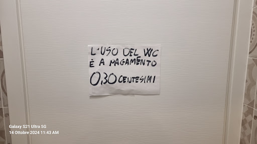 Terribile! Sono stato due volte, la prima volta ho consumato il caffe e pagato con il pos (con prezzo maggiorato), in quanto era stato chiesta la modalità di pagamento prima di dire il prezzo, brutta esperienza. La seconda volta, ci sono tornato perché comodo per me, non per il caffe o servizio perché squallidi, ho pagato contanti con un altro costo rispetto la prima volta pagata con il pos. A fine consumazione sono entrato in bagno per lavare le mani e mi ha chiesto 0.30 centesimi per aver utilizzato il bagno, senza scontrino il caffe e pure il bagno. Il caffe era acqua sporca e il locale era altrettanto sporco e puzzava, servizio pessimo!! STATE ALLA LARGA! SAREBBE DA CHIUDERE! A MAI PIÙ! ORA CAPISCO PERCHÉ È...