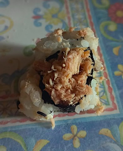 Ma la cosa più grave, 2) Nell'ordine c'era un uramaki Kyoto (e nel loro testuale menu era così composto: "roll di riso farcito con salmone cotto, avocado e philadelphia, guarnito con salmone scottato alla fiamma, condito con salsa teriyaki, tobiko e sesamo).. Chiedendo in fase di ordinazione di rimuovere SOLO l'avocado per un'allergia alimentare, cosa ci portano? Un roll di riso e.... TONNO cotto. Della lattina, letteralmente. Senza niente. Durissimo e il tonno non aveva nemmeno un buon odore! Totalmente INACCETTABILE. 9 euro di roll per cosa? Per del misero tonno in scatola? Allego la foto del singolo pezzo di uramaki con il macro per farvi capire che è tutto 100% vero e onesto!