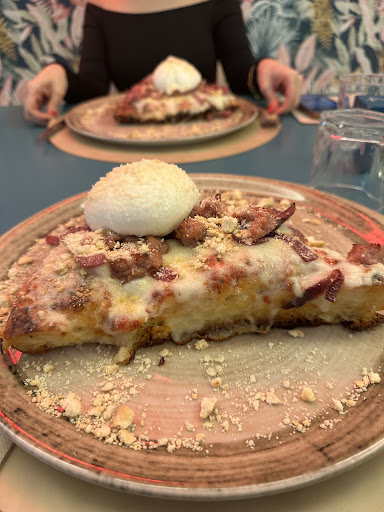 Attirata dalla pubblicità su Instagram oggi mi sono decisa a provare questa pizza a mezzogiorno (viene tanto pubblicizzata questa pausa pranzo...)Nonostante il locale molto carino non si può dire altrettanto del gestore e della cameriera che mi ha servito. Appena ci siamo sedute, eravamo in 2, la cameriera ci ha portato il menù del giorno(un foglio bianco stampato) che recitava :"menù completo 12,9 con 1°/2°, contorno,acqua o bibita o vino e caffè "oppure opzione 1°e contorno più beveraggio e caffè " o "2° e contorno sempre con bibite e caffè " oppure "menù pizza" e i menù dei tranci di pizza. Opto per la pizza e mia mamma per il menù completo. Chiedo alla cameriera come funzionasse il menù pizza e mi risponde che non c'è un menù pizza, nel senso che scegli dal menù pizza e paghi la pizza scelta senza promo mezzogiorno come per l'altro menù...E già mi chiedo cosa scriverlo a fare allora? Vabbé...Ordino una Margherita e una Fanta. Mia madre pasta all'arrabbiata, hamburger e carote al burro e 1/4 di vino bianco. Devo dire che la pizza era buona anche se bruciata(ad un certo punto dalla puzza di bruciato hanno dovuto aprire le finestre)anche se l'ho mangiata alle 13 e sono le 16 e non l'ho ancora digerita...La pasta era buona, non si può dire lo stesso dell'hamburger servito crudo col sangue che colava nel piatto (non ho fatto la foto perché mi faceva un pò senso). Abbiamo chiesto di farlo cuocere e dopo un pò lo hanno riportato con le carote bruciate. Al momento del conto c'era davanti a noi un signore che alla domanda del gestore/cassiere se avesse mangiato bene ha risposto di no e che sarebbe andato da un'altra parte...Mi ha fatto la stessa domanda ed io ho elencato le mancanze facendo notare il famoso "menù pizza". Dapprima mi ha risposto che non c'era scritto alcuna cosa sul menù giornaliero poi che era un errore...Ho pagato in tutto 20,9€. Insomma io dico solo che non...