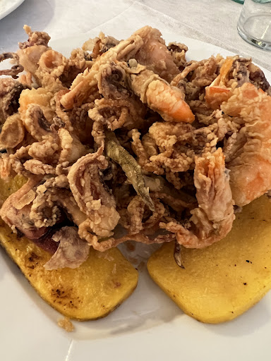 Read moreCercavo un ristorante nella zona per poter mangiare del pesce. In due abbiamo iniziato da un aperitivo, assaggiando 2 diversi vini al calice accompagnati da un crostino. Poi abbiamo deciso di dividerci un antipasto ma purtroppo la tartare di tonno non era più disponibile e così ci è stato proposto del crudo senza molte altre indicazioni. Abbiamo comunque accettato. Ci sono stati serviti 2 piatti con 2 gamberi rossi, 2 scampi e del carpaccio di branzino. Ci siamo poi divisi una frittura mista viste le porzioni molto abbondanti. Da bere mezzo litro di bianco della casa e un litro di acqua. Due amari e due caffè. Purtroppo al momento del conto una sorpresa un po’ amara: ogni pezzo del crudo fatto pagare 4€ l’uno. Considerato che avremmo solamente voluto condividere un antipasto ci è stato praticamente proposto un piatto intero ciascuno e non a modico prezzo. Per il resto tutto positivo: gentilezza e...