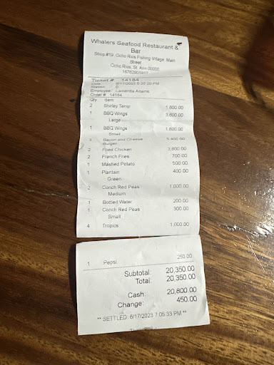 Read moreStop by the Restuarant with my family today had to wait 1:45 mins to be served. Upon receiving the food, the food was cold the burgers as cold as ice the fries were soggy and cold. The chicken was raw and The Chef was not professional waitress was OK but if I had to grade your establishment after spending US$160Whalers Seafood Restaurant & Bar I would’ve given near establishment -0 and for service I would give a zero that was pretty bad. I saw people there had to walk out the chef was in front of the bar looking and talking to girls like he was a customer you have to be more professional in the system if you want to attract people I would not recommend this place whailer to anyone and I will not be eating here as long as I live. I hate to tell you, but you’re in a good location but there needs to be a manager to oversee the daily activities and make sure things are going...