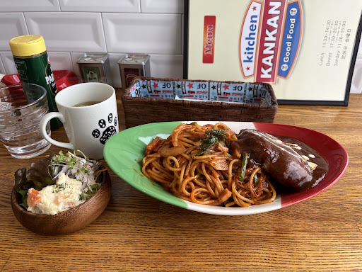 Read more以前いただいたカレーが美味しかったので、再訪はメニュー開いて一番頭に載ってるナポバーグを注文。スープとサラダつき。 太麺に濃いめのケチャップ味が絡むザ・ナポリタンに一人前のハンバーグがデーンと乗っかっておりなかなかボリューミーですが、味付けにクドさはなくペロっといけます。