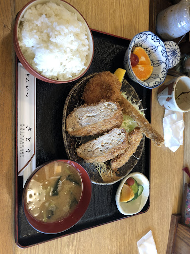 Read more2023/7/17 13:00 頃 * 一年振り。 ランチみっくすセット ¥1150 値上げしてない。 立派。 メンチ、ヒレカツ、アスパラ、カボチャ。 ご飯、味噌汁、漬物、果物。 と盛沢山。 そして、すべてが美味い。 特にナツメグの効いた巨大メンチが美味い。 ソースをベッチャリ付けて頬張った。 アスパラは塩を振った。 サクサク衣にアスパラの果汁。 コイツも美味かった。 大満足。