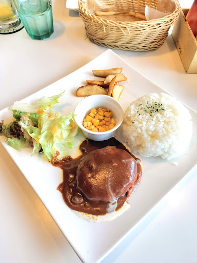 メインのハンバーグは、レタスサラダ、フライドポテト、ライスとともにワンプレートです。 お肉はナツメグの香りが高い。スパイシーな風味とほろ苦さが華やかでおしゃれれな印象。ソースは、2種からデミグラスを選択しました。クリーミーな舌触りが楽しめ、濃厚で美味しい。当たりのソースです。 食後に苦みが効いたホットコーヒーでくつろいだ気分。