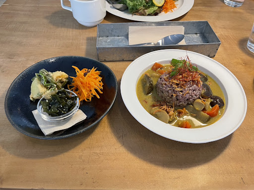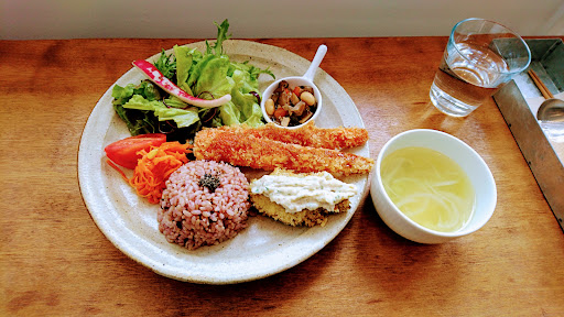 Read more通常は土日月曜日のみの営業。 駐車場なし。生涯学習センターアビスタの向かいにあるので、車の場合はそちらの駐車場などを利用すると良いかと思います。 店内は2名席のテーブルが5つ、カウンター2席。カウンター席と言っても、手前の窓際に2席しかないので、実質2名席っぽい。一番奥のテーブル席はベンチシートになっていたのでちょっと狭くても良いなら4名くらいいけるのかな。 玄米や野菜中心のマクロビカフェ。ランチプレートは週替わりで二種類から選べるようです。スイーツは日替わりかな?行く度に違う味が楽しめるのは良いかなと思います。 この日は人参フライとベジカキフライのランチプレートを注文しました。もう一方はゴボウのチャプチェでした。玄米がとてもおいしかったです。人参フライは衣がサクッとしてたしベジカキフライ(舞茸を使っていました)もおいしかったのですが、付け合わせがキャロットラペだったり、人参の入った煮物だったり、ちょっと組み合わせが下手かなと思いました。もう少し違う種類の野菜をたくさん組み合わせてくれたら良かったなと思います。 スタッフは母娘でやっているのかしら?年配の方は愛想が良く、お店を出るときもわざわざ外までお見送りいただいて気持ち良かったのですが、若いスタッフさんは声も小さく、接客慣れしていない雰囲気を感じました。 店内の雰囲気やインテリアなどとてもかわいらしくて、料理も可能性を感じるお店でしたが、スタッフさんの対応があまり良い印象ではなかったので、また行...