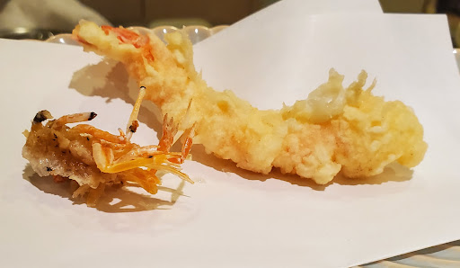 初めて利用しました。 我孫子駅北口の開発に伴い10数年前に湖北駅前から移転してきた老舗の天ぷら屋さんです。 駅から徒歩5分ぐらいですが、店舗前に4~5台分の駐車場があります。 奥はわかりませんが、店舗に入ると座敷に4人用のテーブルが3卓と、6人ほどが座れるカウンターがあります。 予約して2名で行きましたが、カウンターに案内されました。 天ぷらコースの松を注文し、程なく車海老の天ぷらが提供され、その後野菜や穴子などが提供されます。 カウンターということもあり、食べ終わった頃を見計らい丁度良いタイミングで提供されます。 肝心の天ぷらですが、車海老は小ぶりで海老の旨味が少なく感じ、お野菜や穴子の天ぷらも揚げ具合が今一つで、少し残念に思いました。 特に酷かったのは、最後にいただいたかき揚げです。具は小海老が多く見た目はとても美味しそうでしたが、実際は揚げが甘く小麦粉が生でクリーム状になって残っている状態でした。 二人で約1万円。期待が高かっただけに、...