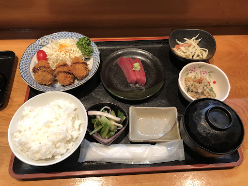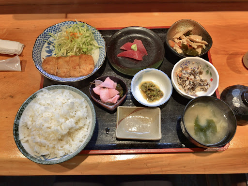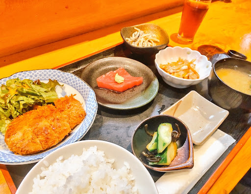 アジフライにかれて入店しましたが店長おすすめの「ざこや定食」を注文しました。小鉢が多く、満足感のあるメニューでした。ひとつひとつが丁寧に作られた味でとても美味しかったです。トンカツが柔らかい…マグロも美味しい…。特に筍のお味噌汁は具沢山で素敵でした。 母はアジフライ定食を頼み、分厚い身のフライが2枚でてきてビックリ。あんなに美味しいアジフライが2枚も食べられるなんてと感動していました。