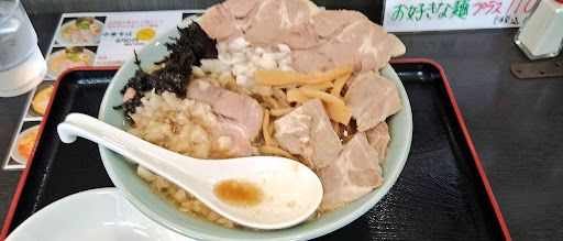 メニューには炒め野菜に・・・と書かれてますが、 炒め野菜の量は少しです。 チャーシューが冷たいので、スープにinしました。 卓上に七味(一味)が欲しかったです。